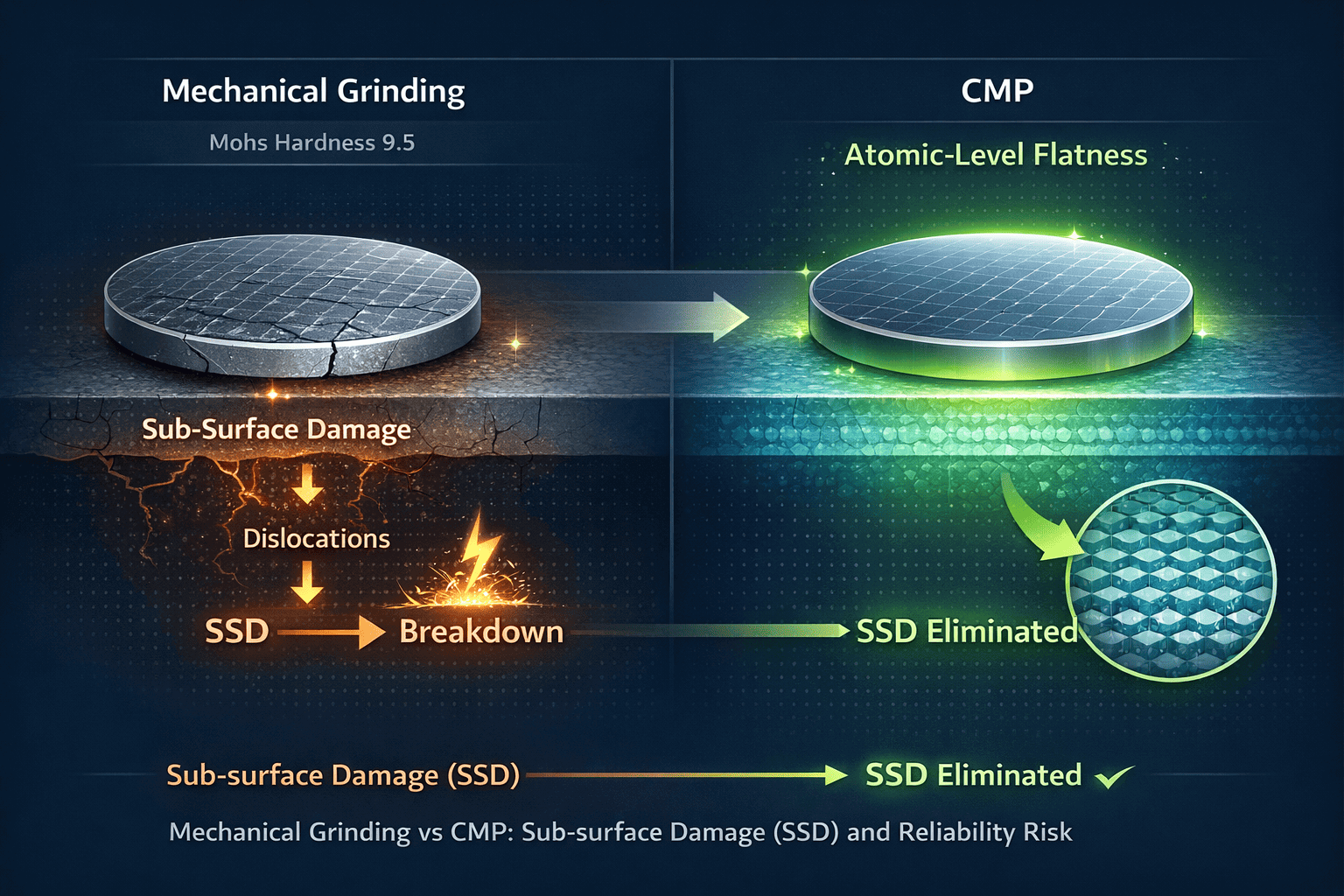 Скокът в производителността на полупроводниците често се ограничава от прецизността на обработката. С твърдост по Моос от 9,5, SiC е известен като труден за обработка. Традиционното механично смилане често оставя след себе си „скрити белези“ — подповърхностно увреждане (SSD) — което може да се разпространи като дислокации по време на последващ епитаксиален (Epi) растеж, което в крайна сметка води до катастрофална повреда на устройството под високо напрежение.
