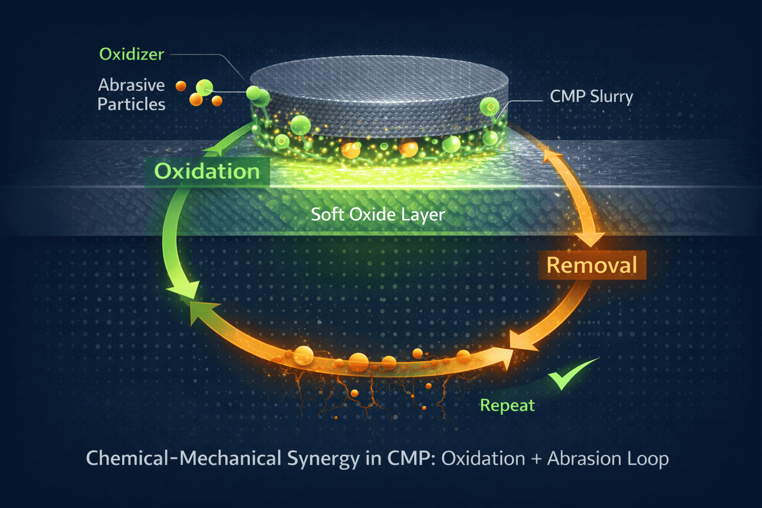 Както беше отбелязано от Jihoon Seo, водещ авторитет в изследванията на CMP, съвременната планаризация се измести от „обемно премахване“ към „реконструкция на повърхността в атомен мащаб“. Чрез използване на синергия от химическо окисление и механична абразия, CMP създава чиста повърхност без дефекти. По същество превъзходният CMP процес не е просто полиране на пластина; той създава атомната основа за електронния поток.